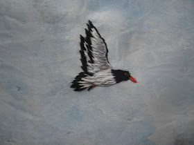 I am now working on Mo's pennant. I painted the long thin triangular piece, called Mending the Sky and embroidered the first bird, an oystercatcher. This is a piece that will fly off to Australia to be part of a wonderful installation - see the label below and look at Mo Crows blog to find out more. Pennants are winging their way from all over the world!